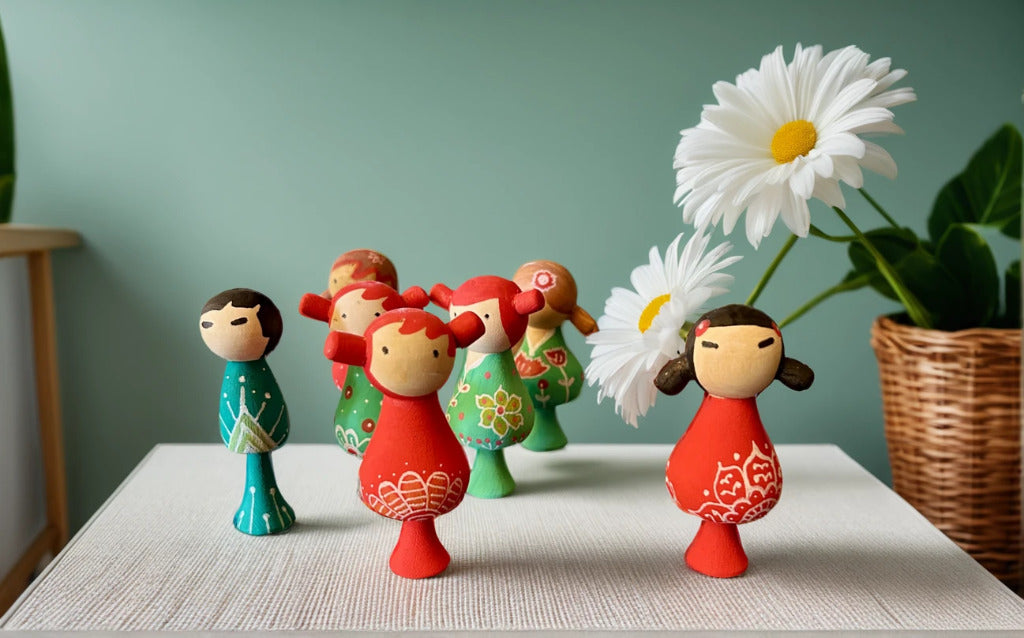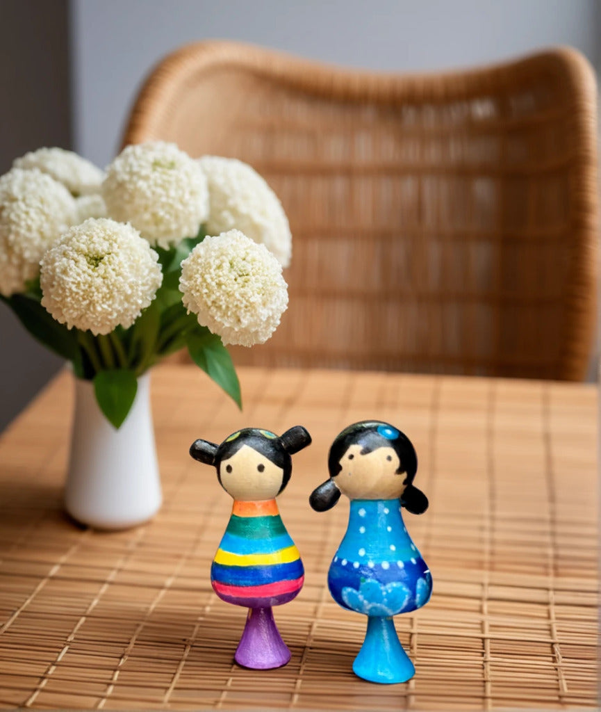 MATERIAL: Two dolls crafted from sustainable wood, a colour set, comprehensive literature.