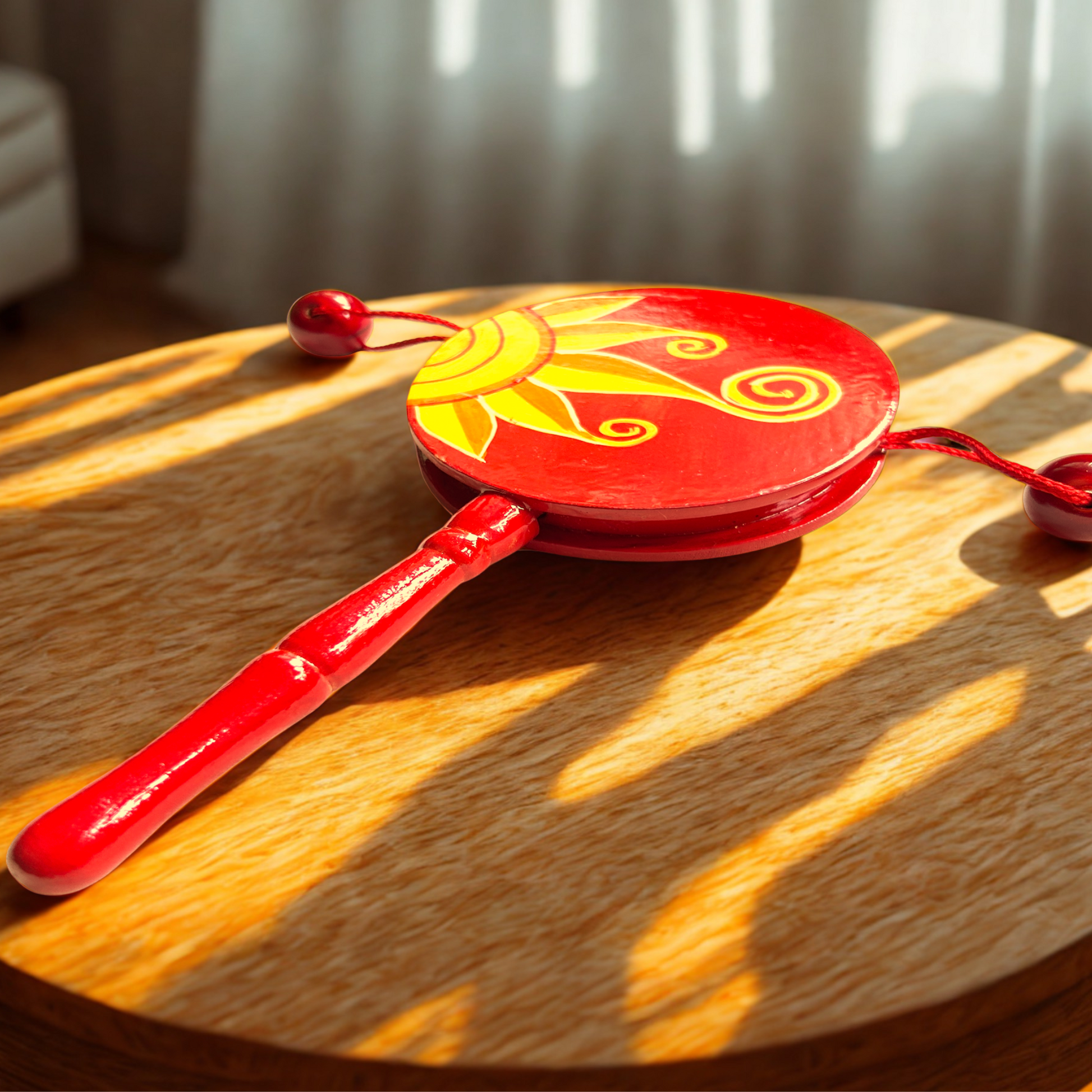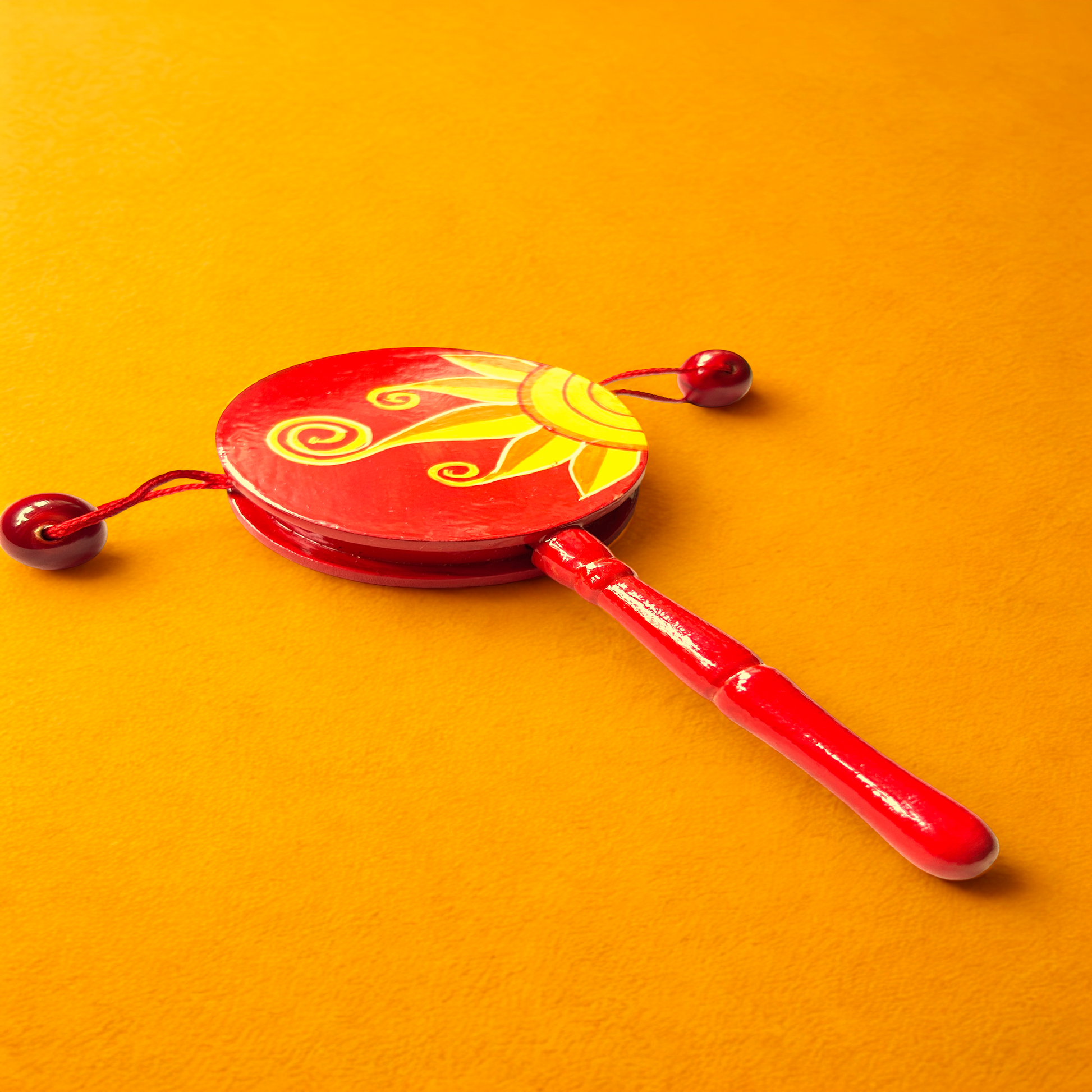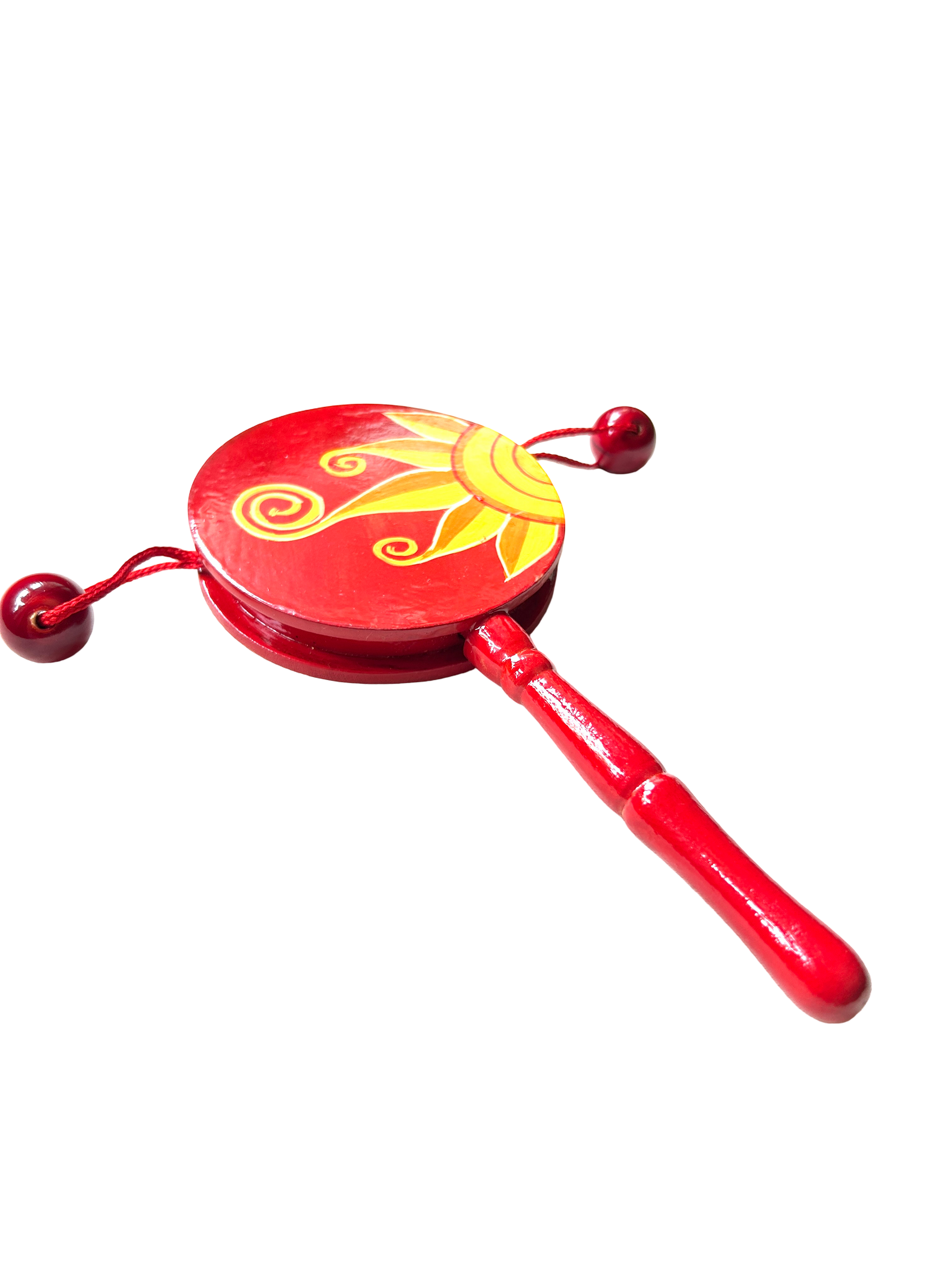 Den den daiko is a drum-like, hand held musical instrument with two heads, a handle, and beads attached to strings on either side of the drum. It's played by spinning the handle between the hands, causing the beads attached to the strings to hit the drum heads and produce a rhythmic sound.