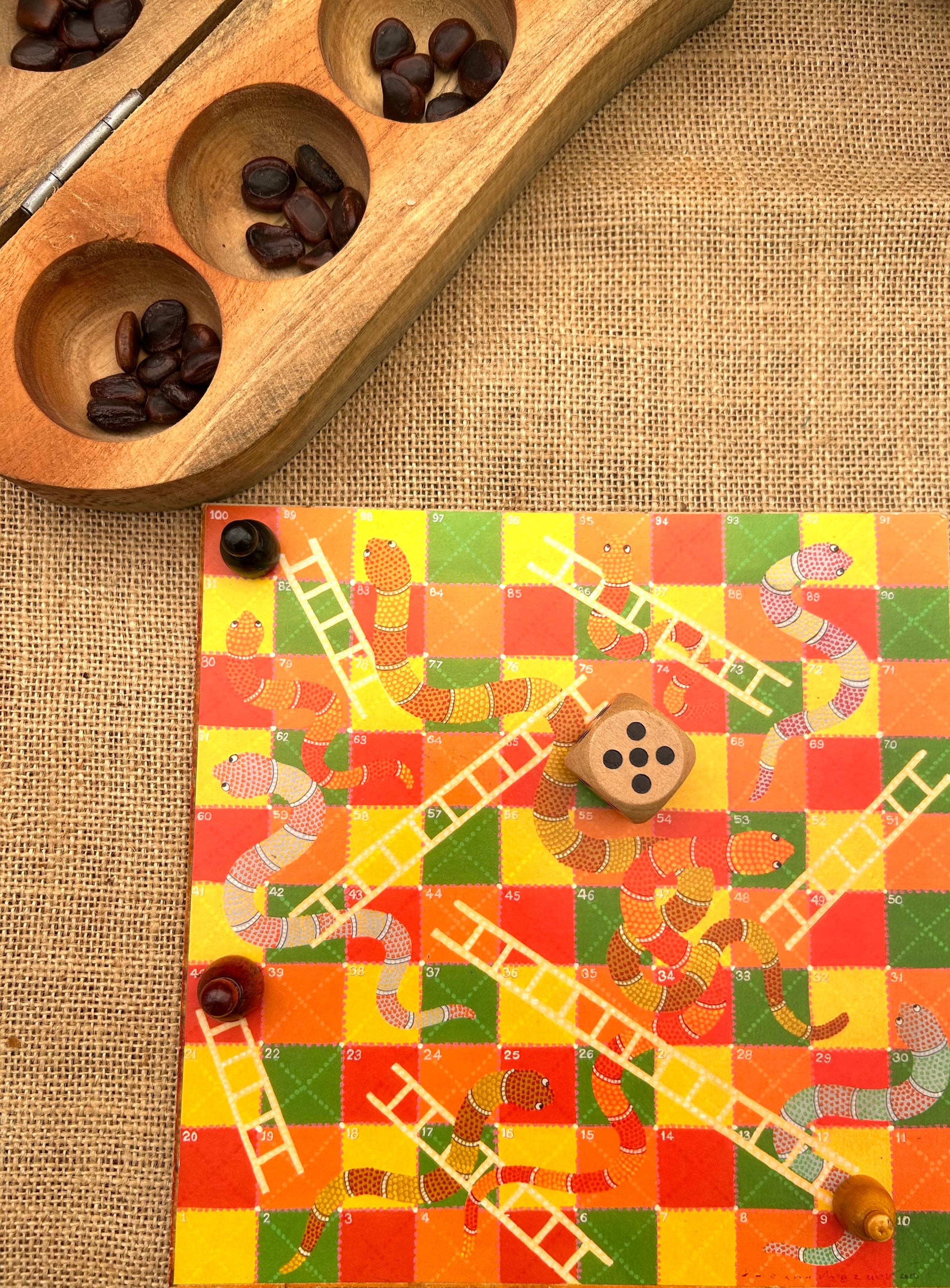 MATERIAL: Digital print pasted on an mdf board with lacquered counters and a wooden dice, score book, comprehensive instruction sheet.